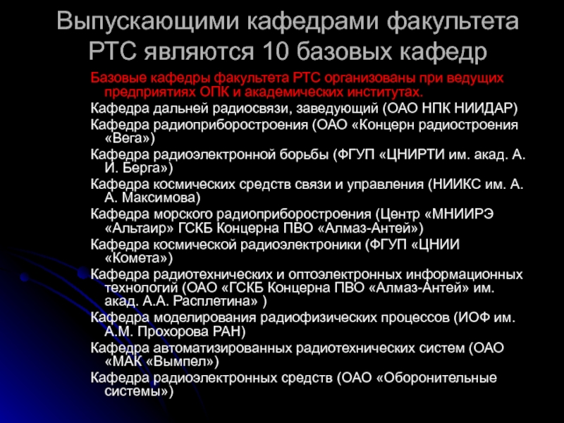 Слайд 15Выпускающими кафедрами факультета РТС являются 10 базовых кафедр