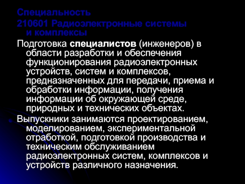 Выпускники занимаются проектированием, моделированием, экспериментальной отработкой, подготовкой производства и техническим обслуживанием радиоэлектронных систем, комплексов и устройств различного назначения.