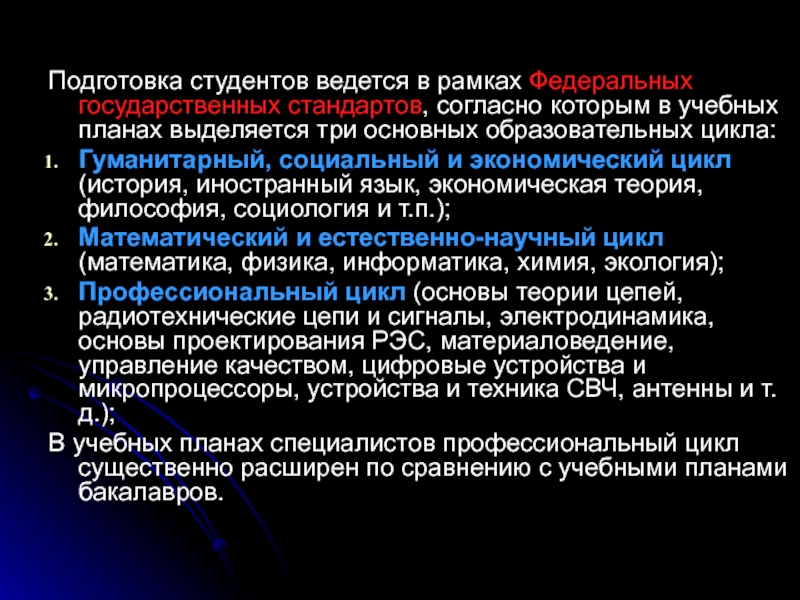 Профессиональный цикл (основы теории цепей, радиотехнические цепи и сигналы, электродинамика, основы проектирования РЭС, материаловедение, управление качеством, цифровые устройства и микропроцессоры, устройства и техника СВЧ, антенны и т.д.);