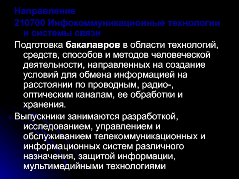 Выпускники занимаются разработкой, исследованием, управлением и обслуживанием телекоммуникационных и информационных систем различного назначения, защитой информации, мультимедийными технологиями