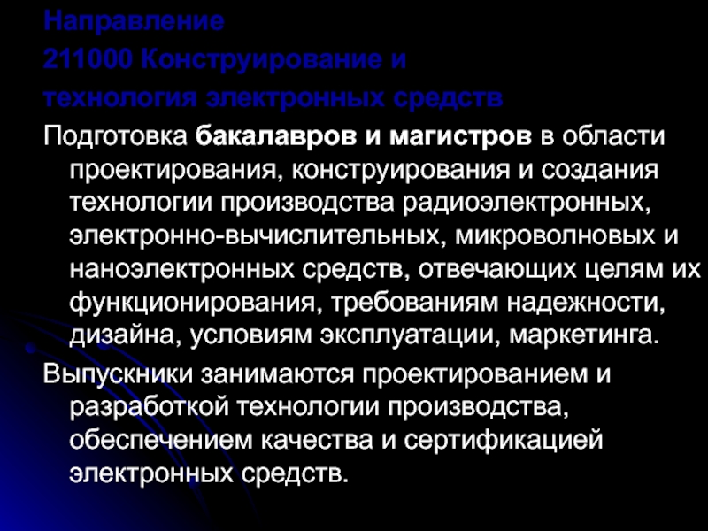 проектирования, конструирования и создания технологии производства радиоэлектронных, электронно-вычислительных, микроволновых и наноэлектронных средств, отвечающих целям их функционирования, требованиям надежности, дизайна, условиям эксплуатации, маркетинга.