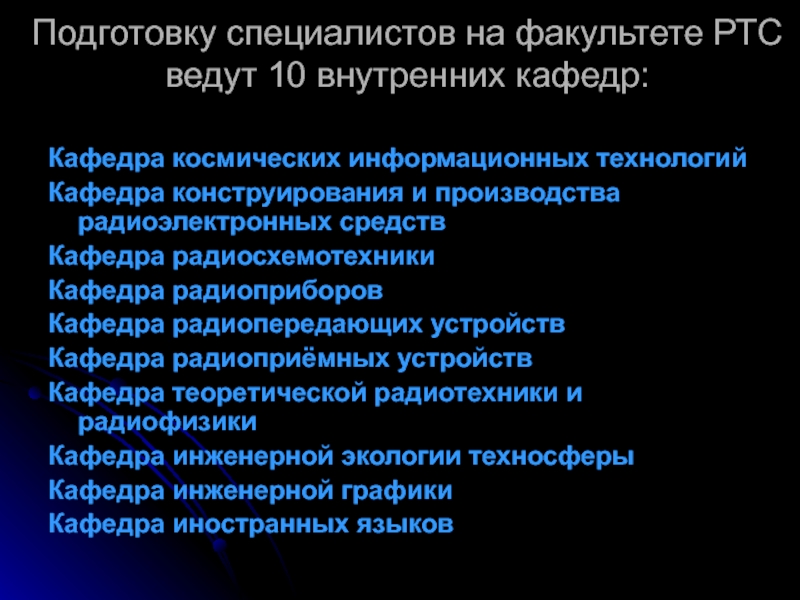 Слайд 14Подготовку специалистов на факультете РТС ведут 10 внутренних кафедр: