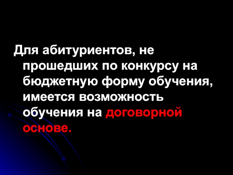Слайд 25Для абитуриентов, не прошедших по конкурсу на бюджетную форму обучения, имеется