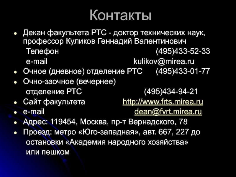 Декан факультета РТС - доктор технических наук, профессор Куликов Геннадий Валентинович