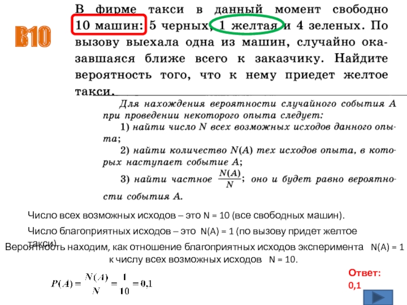 Число всех возможных исходов – это N = 10 (все свободных машин).