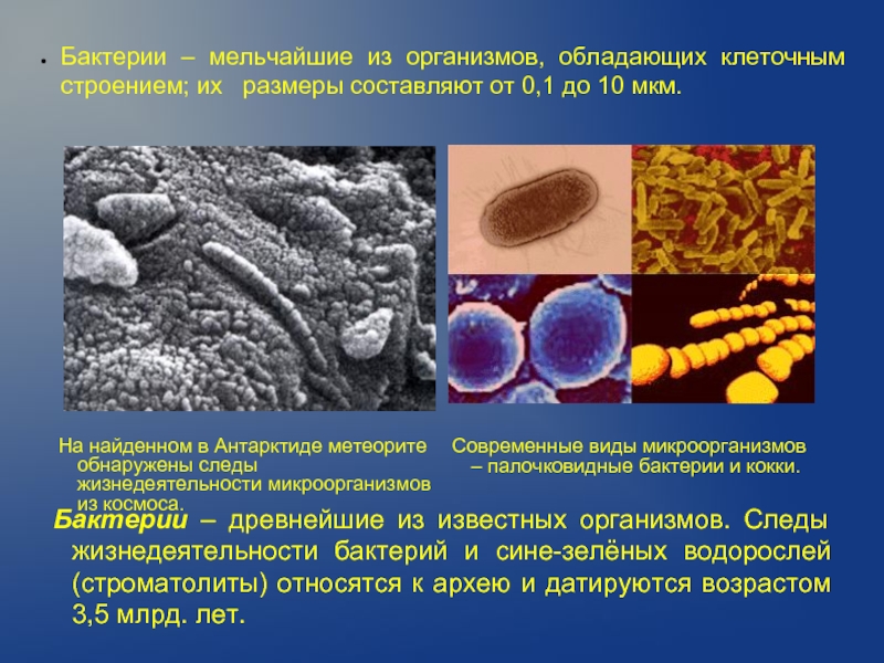 Бактерии – мельчайшие из организмов, обладающих клеточным строением; их размеры составляют от 0,1 до 10 мкм.