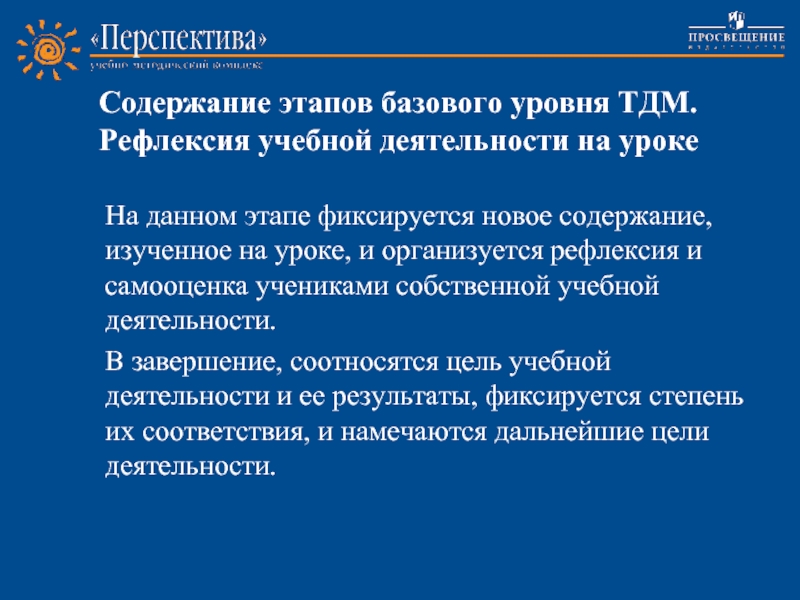В завершение, соотносятся цель учебной деятельности и ее результаты, фиксируется степень их соответствия, и намечаются дальнейшие цели деятельности.