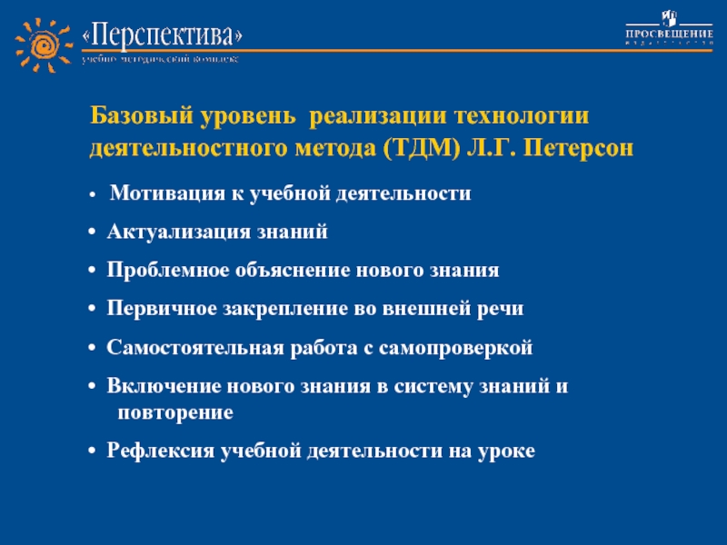 Слайд 40Базовый уровень реализации технологии деятельностного метода (ТДМ) Л.Г. Петерсон