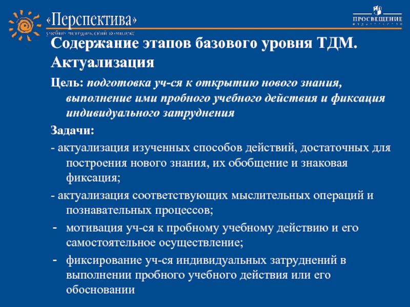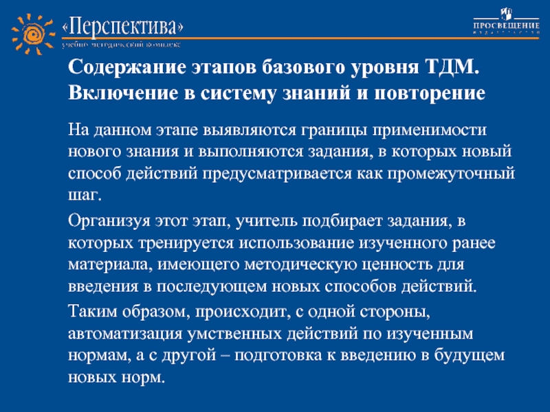 Организуя этот этап, учитель подбирает задания, в которых тренируется использование изученного ранее материала, имеющего методическую ценность для введения в последующем новых способов действий.