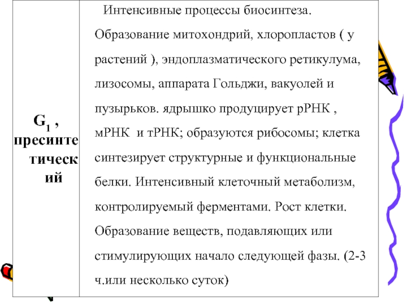 1. Интерфаза. Период интенсивного синтеза и роста. В клетке синтезируется много веществ, необходимых для ее роста и осуществления всех свойственных ей функций. Во время интерфазы происходит репликация ДНК.