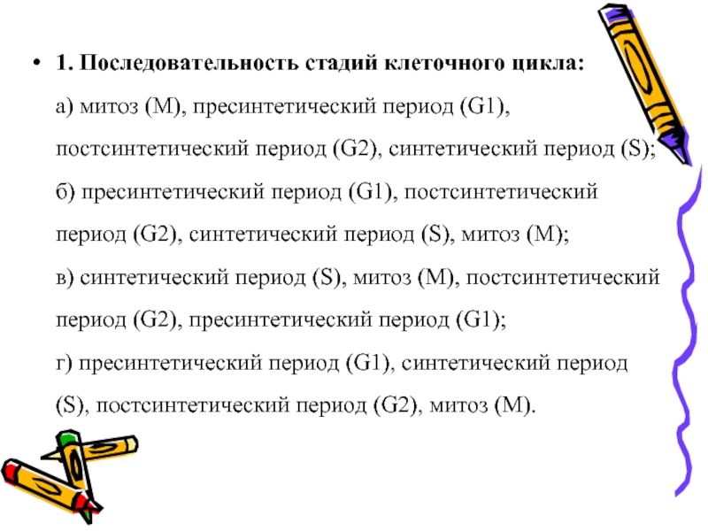 г) пресинтетический период (G1), синтетический период (S), постсинтетический период (G2), митоз (М).