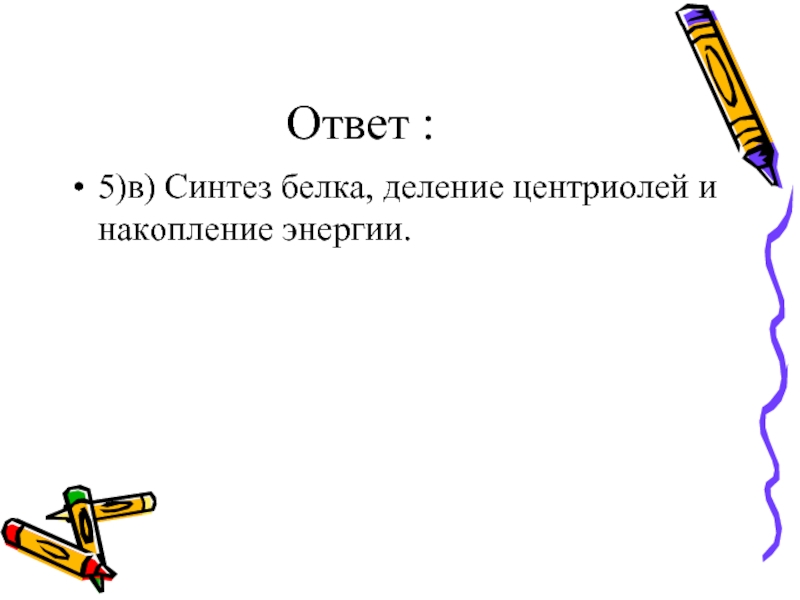5)в) Синтез белка, деление центриолей и накопление энергии.