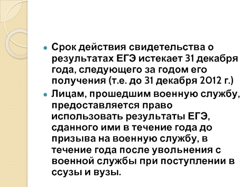 Лицам, прошедшим военную службу, предоставляется право использовать результаты ЕГЭ, сданного ими в течение года до призыва на военную службу, в течение года после увольнения с военной службы при поступлении в ссузы и вузы.
