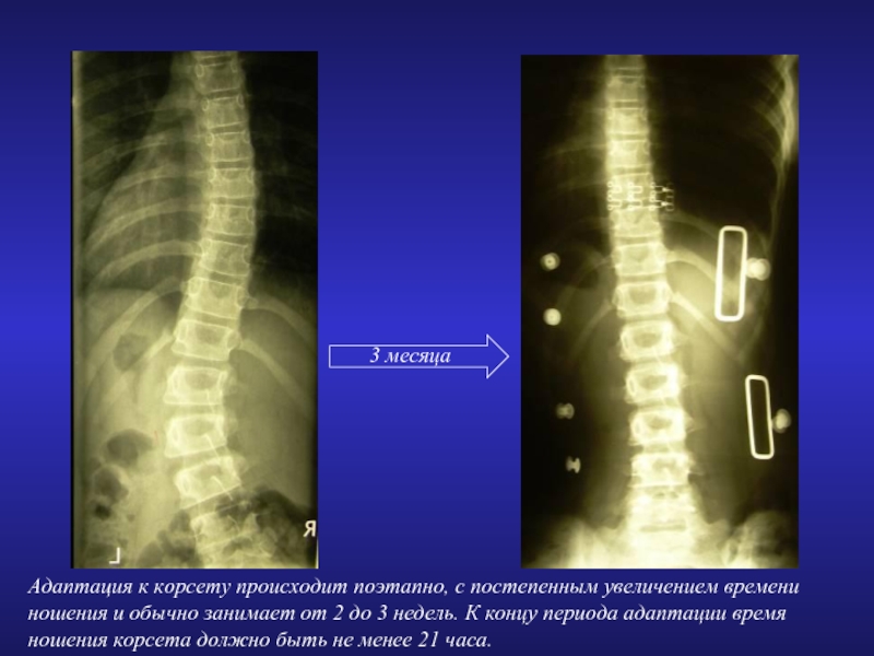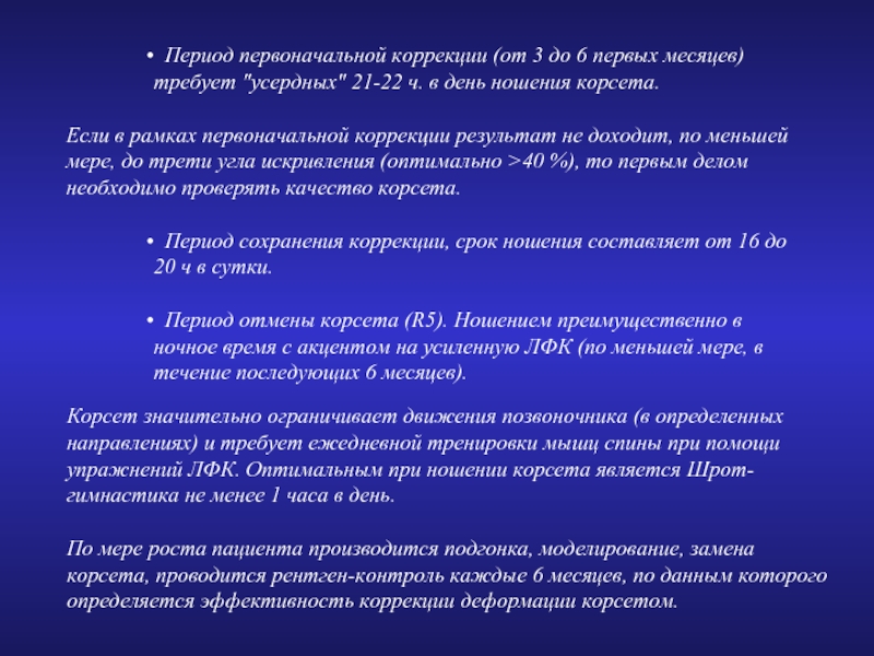 По мере роста пациента производится подгонка, моделирование, замена корсета, проводится рентген-контроль каждые 6 месяцев, по данным которого определяется эффективность коррекции деформации корсетом.