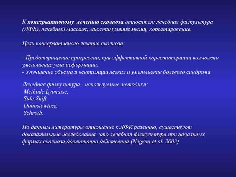 Выработка индивидуального статикодинамического режима — исключение порочных поз, соблюдение оптимальной двигательной активности, функциональное исправление деформаций позвоночника и грудной клетки лечебной гимнастикой, плавание, постизометрическая релаксация;