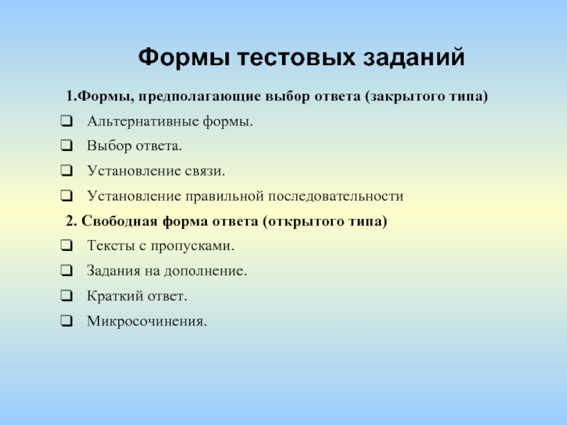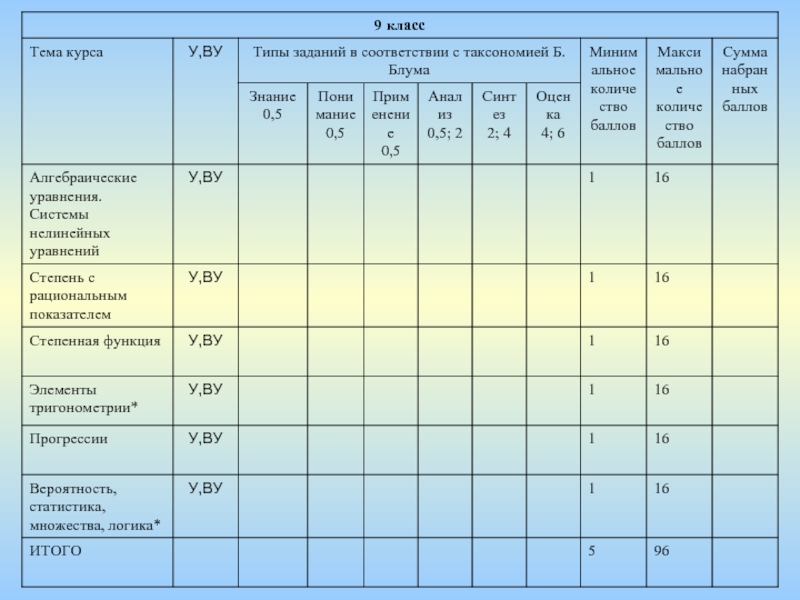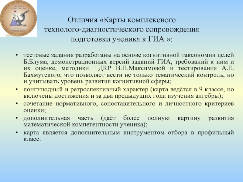 тестовые задания разработаны на основе когнитивной таксономии целей Б.Блума, демонстрационных версий заданий ГИА, требований к ним и их оценке, методики ДКР В.Н.Максимовой и тестирования А.Е.Бахмутского, что позволяет вести не только тематический контроль, но и учитывать уровень развития когнитивной сферы;