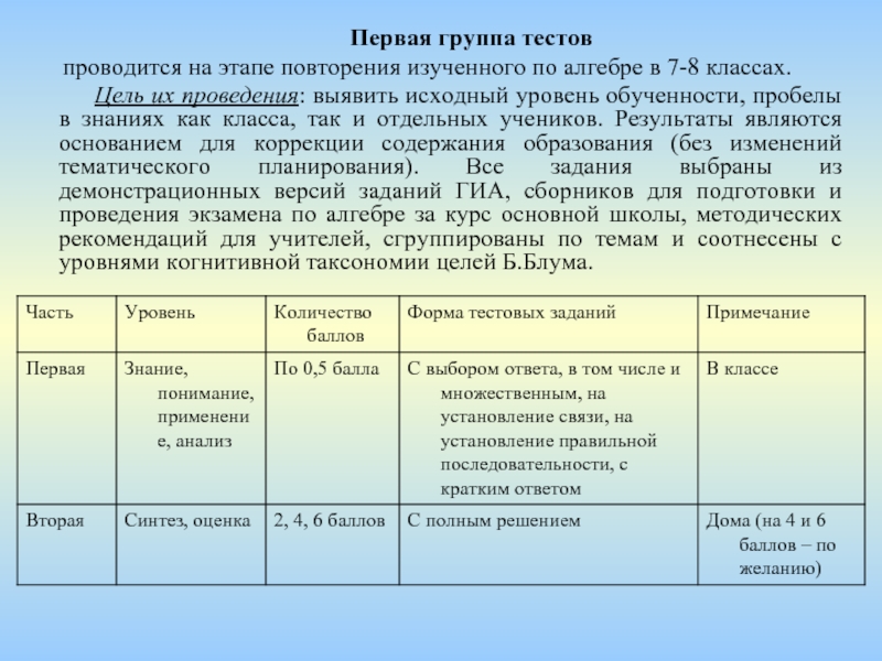 Цель их проведения: выявить исходный уровень обученности, пробелы в знаниях как класса, так и отдельных учеников. Результаты являются основанием для коррекции содержания образования (без изменений тематического планирования). Все задания выбраны из демонстрационных версий заданий ГИА, сборников для подготовки и проведения экзамена по алгебре за курс основной школы, методических рекомендаций для учителей, сгруппированы по темам и соотнесены с уровнями когнитивной таксономии целей Б.Блума.