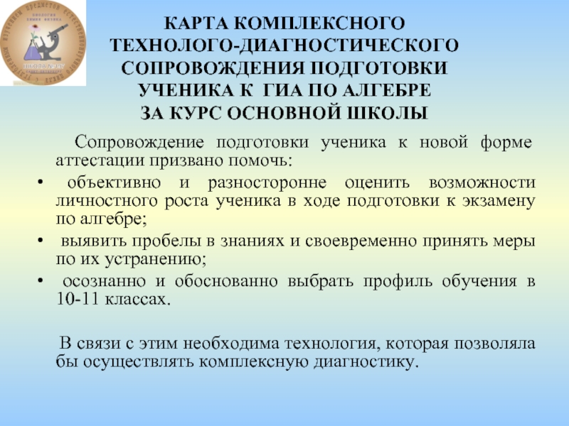 объективно и разносторонне оценить возможности личностного роста ученика в ходе подготовки к экзамену по алгебре;