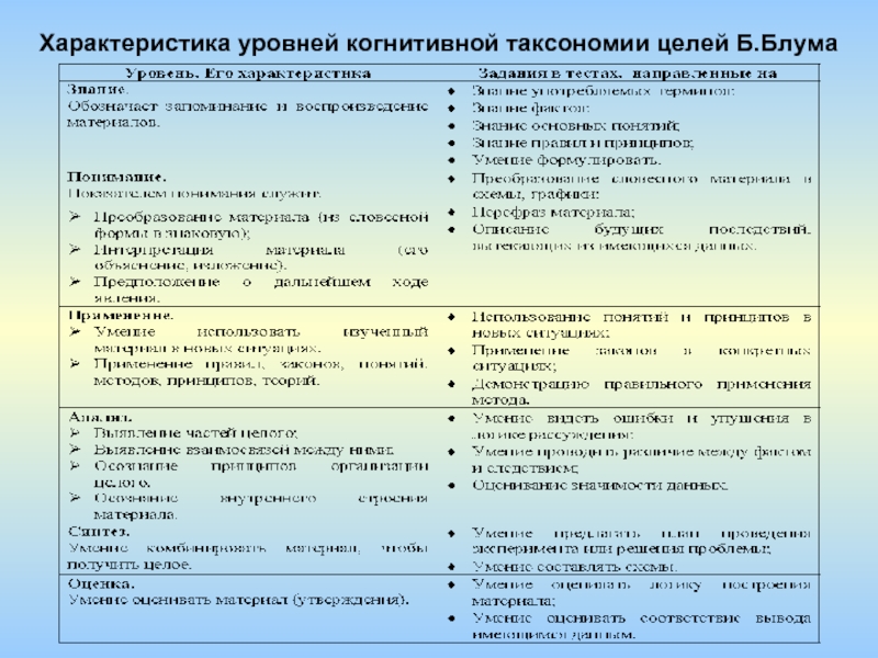 Слайд 6Характеристика уровней когнитивной таксономии целей Б.Блума