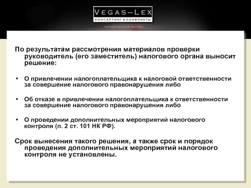 Слайд 7По результатам рассмотрения материалов проверки руководитель (его заместитель) налогового органа выносит