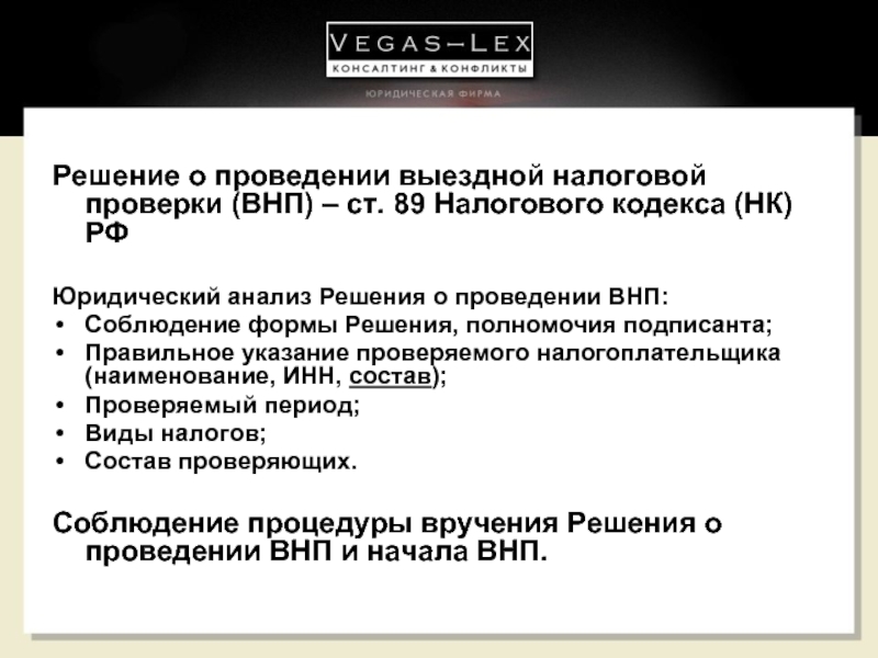 Решение о проведении выездной налоговой проверки (ВНП) – ст. 89 Налогового