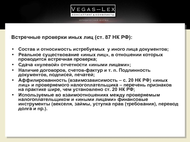 Слайд 4Встречные проверки иных лиц (ст. 87 НК РФ):