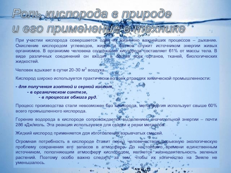 При нормальных условиях кислород – бесцветный газ, без запаха и вкуса. Температура кипения 183˚С, тяжелее воздуха, плотность 1,43 г/см3. В 1л воды при нормальных условиях растворяется 0,04г кислорода.