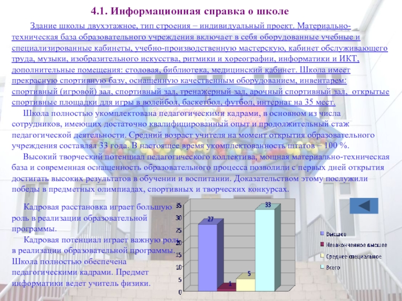 Кадровая потенциал играет важную роль в реализации образовательной программы. Школа полностью обеспечена педагогическими кадрами. Предмет информатики ведет учитель физики.