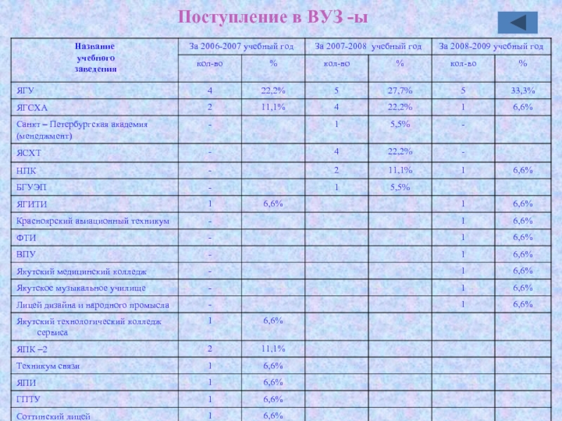 В качестве доказательства ниже приводим таблицу поступаемости выпускников 2009-2010 учебного года: