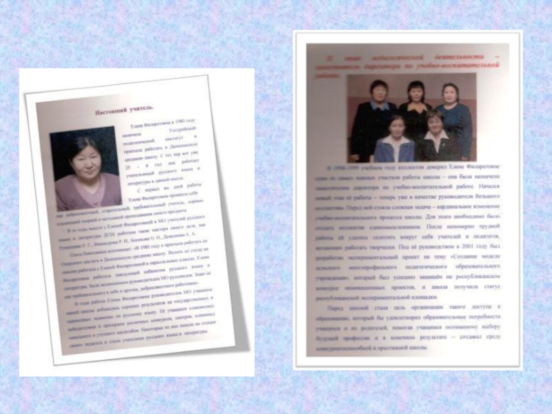 Вот уже 30 лет я работаю в школе. Начинала свою педагогическую деятельность учителем русского языка и литературы в Дюпсюнской средней школе. С замиранием сердца в 1979 году я переступила порог этой школы, одной из старейших в республике. Я тогда еще не знала, что именно здесь пройдет многолетний путь моего становления как педагога. Прослеживая свою педагогическую работу, пришла к такому выводу: и как учитель, и как руководитель я состоялась, но самое главное - снискала любовь и уважение учеников, их родителей. Недаром учащиеся посвятили мне такие искренние строки: «Вы настоящий учитель и завуч. Вашу помощь мы ощущали везде».