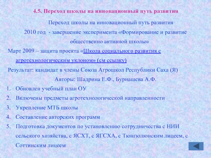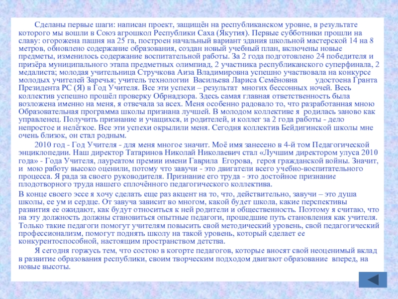 2005-2007 годы – годы плодотворной работы по эксперименту непрерывного педагогического образования, годы творческого роста. Много сил было приложено, чтобы школу вновь признали в числе лучших. В 1998 году я стала завучем в самый трудный период, когда из числа выпускников только 1-2 ученика могли поступить в ВУЗ. Годы напряженной, но плодотворной работы не прошли даром. Правильно говорят: «Терпение и труд всё перетрут». Сплачивая педагогический коллектив, ставя новые цели и задачи, обновляя содержание образования в школе, поддерживая творческие инициативы своих коллег, находя новые инновационные пути развития, воплощая новые идеи в практику, работала так, чтобы достичь высоких результатов, завоевать доверие учащихся, родителей и коллег. В результате такой работы, умело используя и активно внедряя современные образовательные технологии в учебный процесс, мои учителя решили вопросы по улучшению качества обучения, системно совершенствовали своё педагогическое мастерство, повышали творческий потенциал. Но самым большим делом было инициирование мною перехода школы на новый путь развития. Это было в далёком 2000 году. В 2005 году эксперимент расширился. Успешно представила проект «Школа как социокультурный центр с педагогическим профилем» на республиканском конкурсе инновационных проектов, и школа получила статус республиканской экспериментальной площадки. Думаю, что моя работа по двум проектам оценена. Школа стала обладателем Гранта Президента Республики Саха (Якутия).