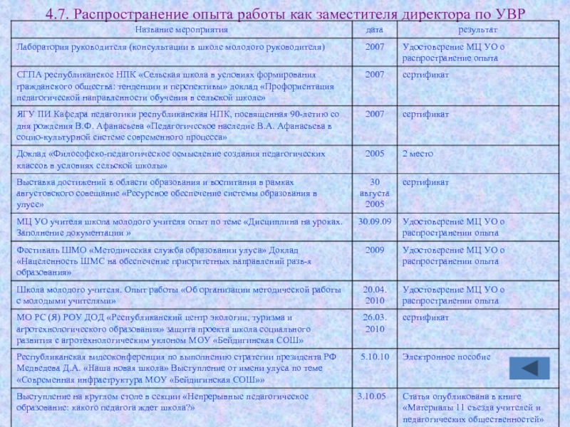 Заместитель директора по УВР Дюпсюнской средней общеобразовательной школы с педагогическим профилем имени И.Н. Жиркова (2005-2007 годы)