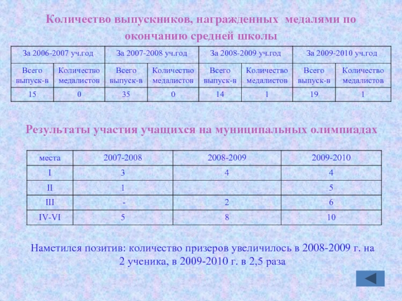 Наметился позитив: количество призеров увеличилось в 2008-2009 г. на 2 ученика, в 2009-2010 г. в 2,5 раза