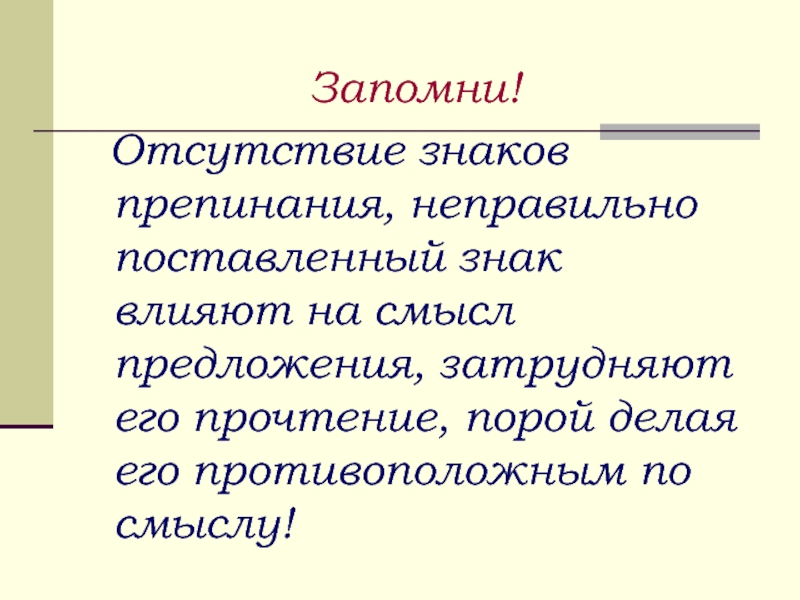 Отсутствие знаков препинания, неправильно поставленный знак влияют на смысл предложения,