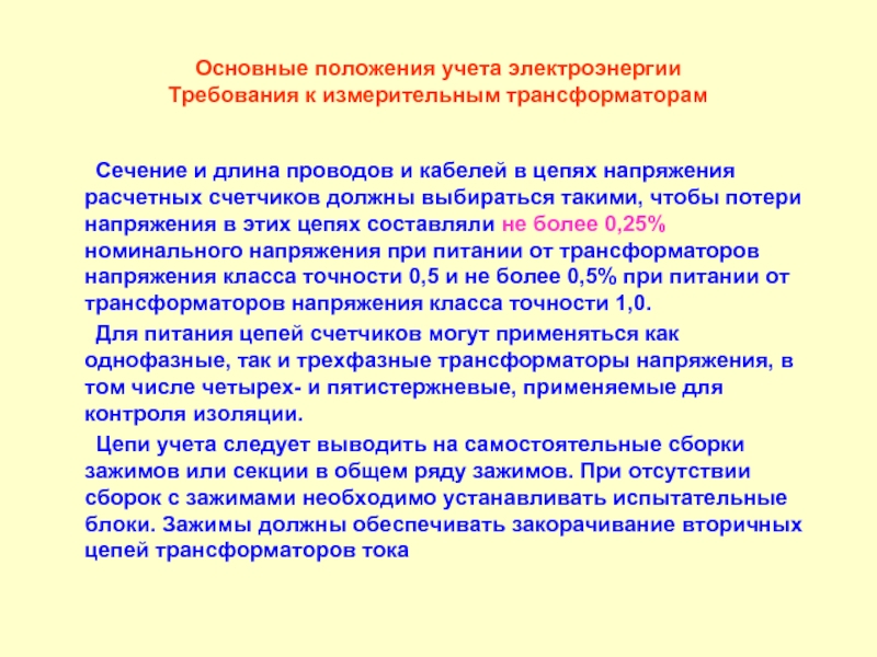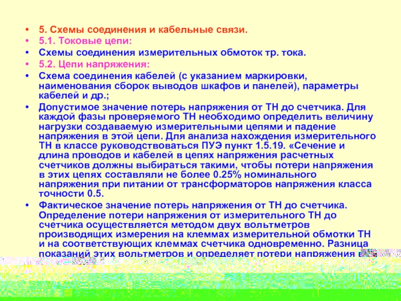 Допустимое значение потерь напряжения от ТН до счетчика. Для каждой фазы проверяемого ТН необходимо определить величину нагрузки создаваемую измерительными цепями и падение напряжения в этой цепи. Для анализа нахождения измерительного ТН в классе руководствоваться ПУЭ пункт 1.5.19. «Сечение и длина проводов и кабелей в цепях напряжения расчетных счетчиков должны выбираться такими, чтобы потери напряжения в этих цепях составляли не более 0.25% номинального напряжения при питании от трансформаторов напряжения класса точности 0.5.