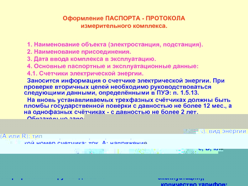 Заносится информация о счетчике электрической энергии. При проверке вторичных цепей необходимо руководствоваться следующими данными, определёнными в ПУЭ: п. 1.5.13.