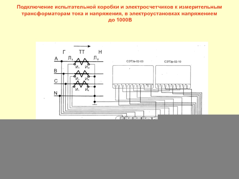 6. Приведите порядок подключения электросчетчиков выше 1000В через испытательную коробку?