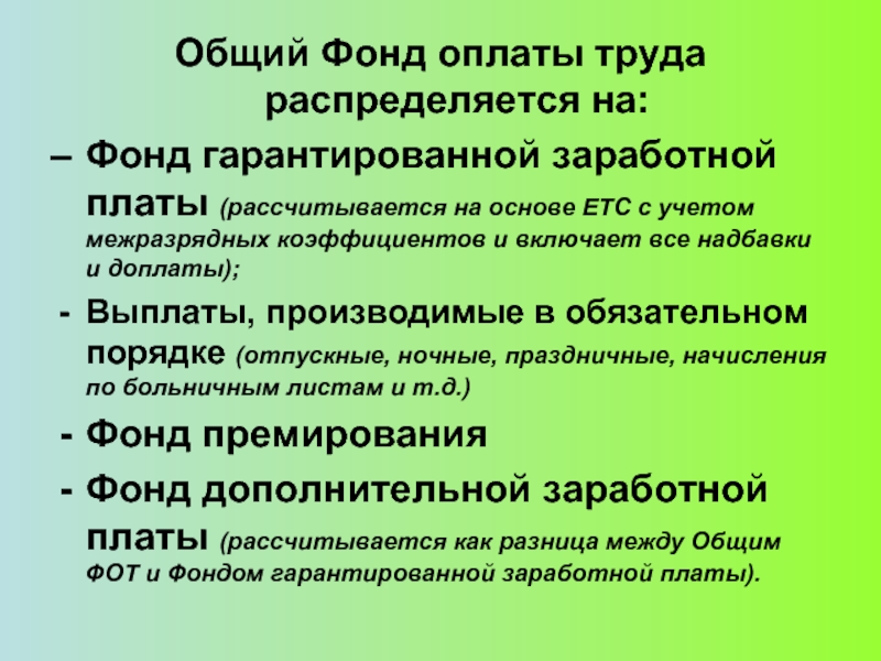 Слайд 4Общий Фонд оплаты труда распределяется на: