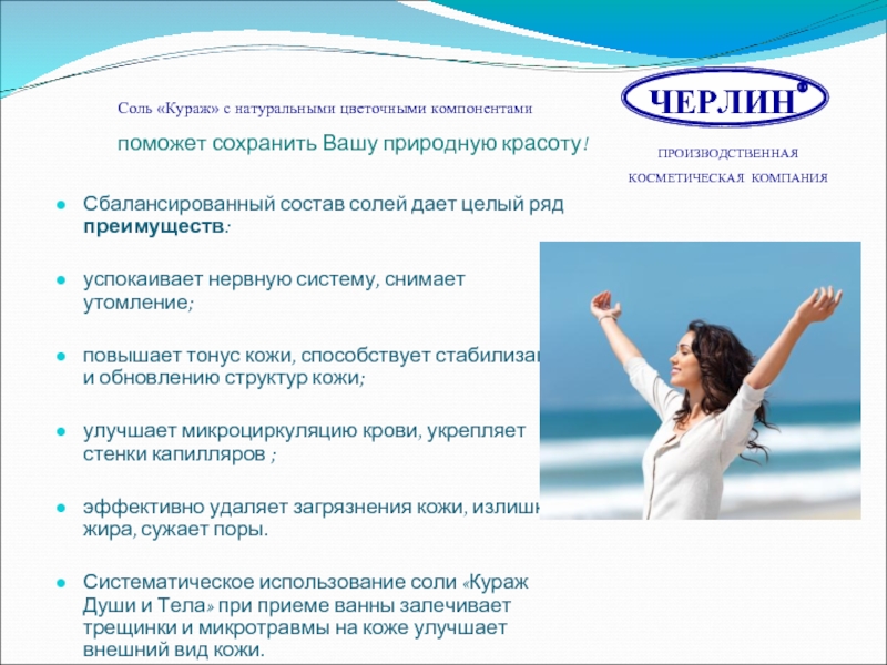 Слайд 2Соль «Кураж» с натуральными цветочными компонентами поможет сохранить Вашу природную красоту!