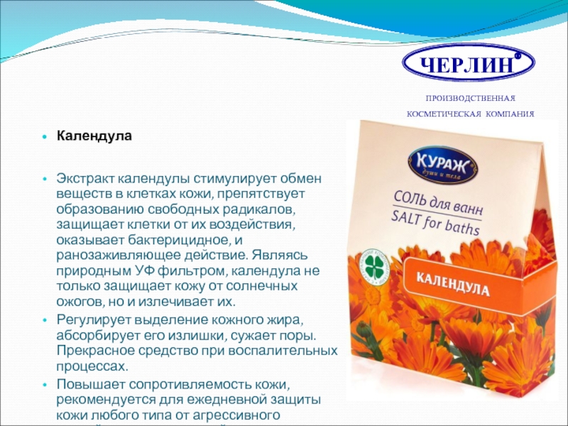радикалов, защищает клетки от их воздействия, оказывает бактерицидное, и ранозаживляющее действие. Являясь природным УФ фильтром, календула не только защищает кожу от солнечных ожогов, но и излечивает их.