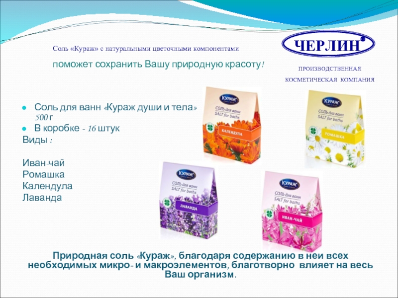 Слайд 1Соль «Кураж» с натуральными цветочными компонентами поможет сохранить Вашу природную красоту!