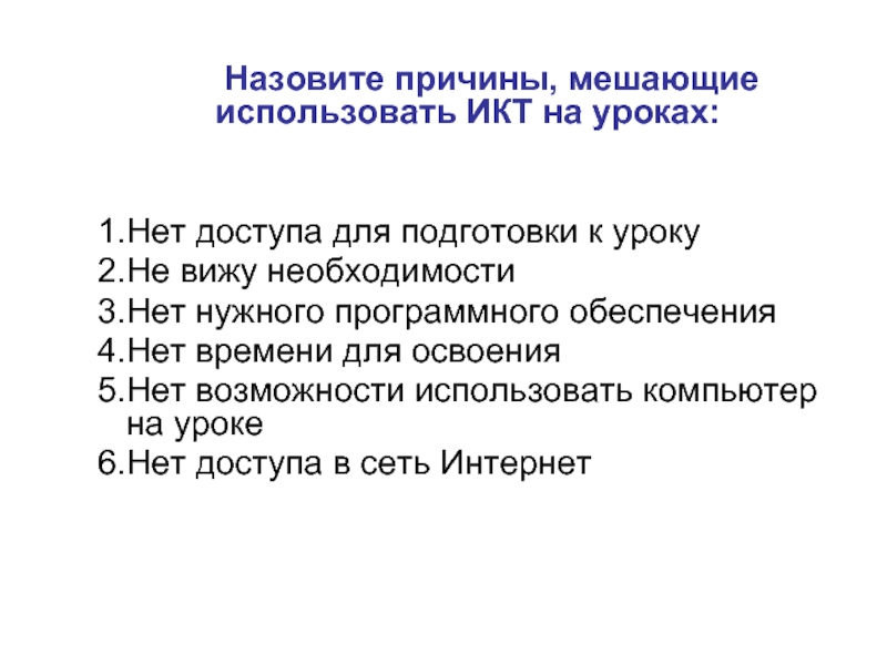 Слайд 25 Назовите причины, мешающие использовать ИКТ на уроках: