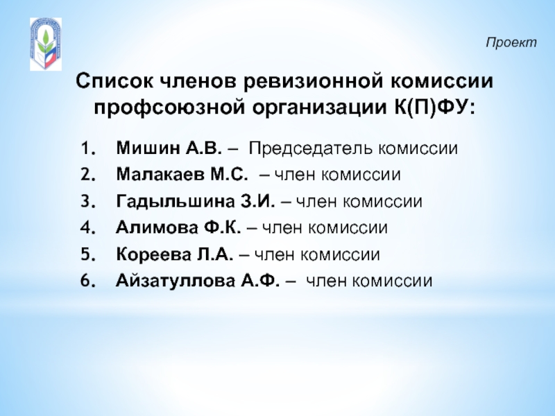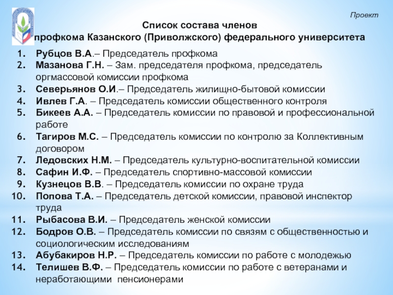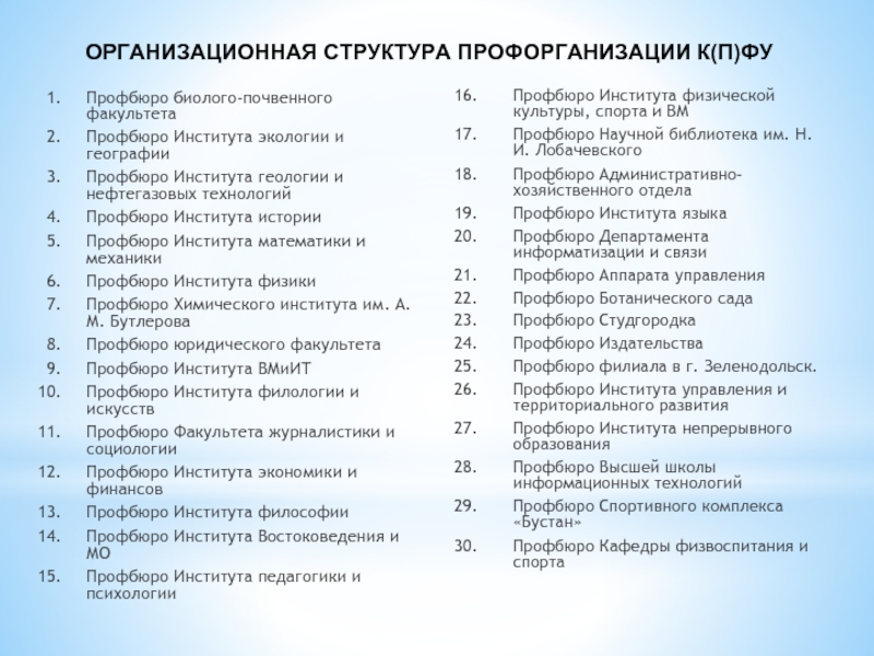 1. «О завершении реорганизации профсоюзных организаций КГФЭИ и ТГГПУ путем присоединения к профсоюзной организации К(П)ФУ».