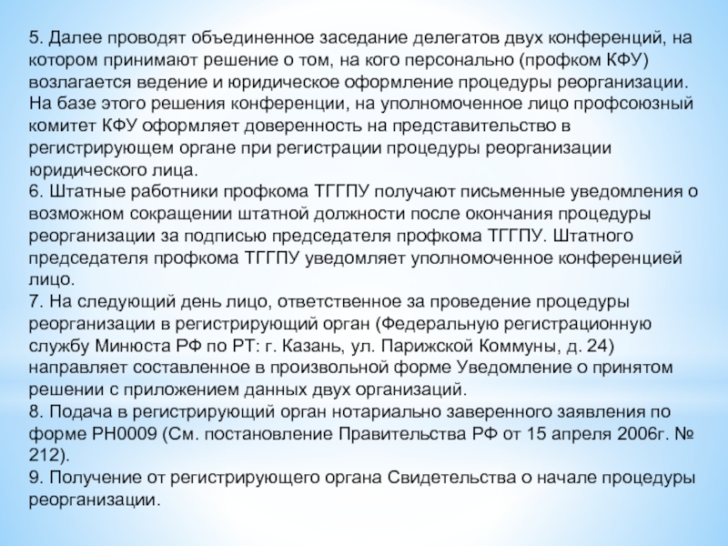 решение о том, на кого персонально (профком КФУ) возлагается ведение и юридическое оформление процедуры реорганизации. На базе этого решения конференции, на уполномоченное лицо профсоюзный комитет КФУ оформляет доверенность на представительство в регистрирующем органе при регистрации процедуры реорганизации юридического лица.