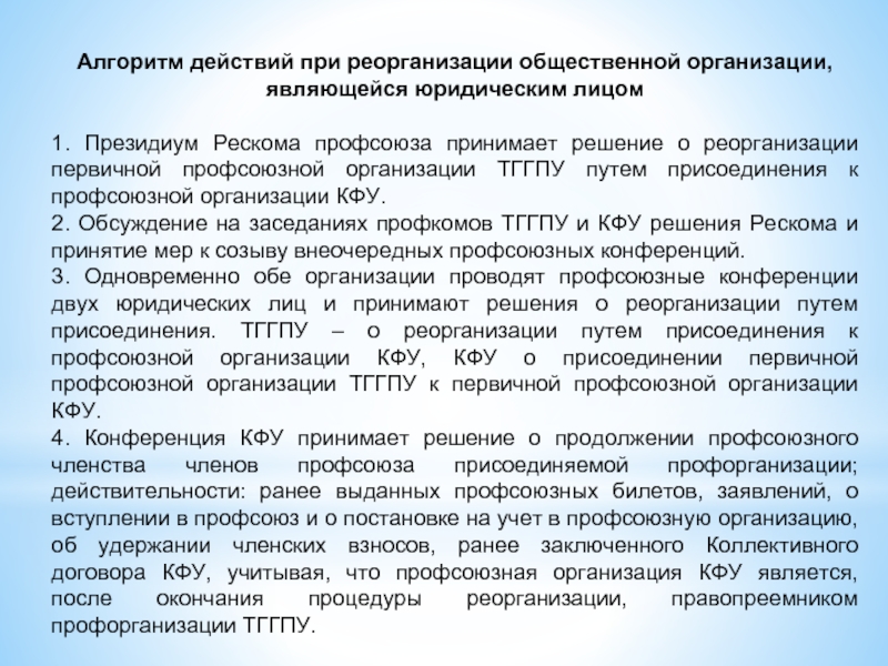3. Одновременно обе организации проводят профсоюзные конференции двух юридических лиц и принимают решения о реорганизации путем присоединения. ТГГПУ – о реорганизации путем присоединения к профсоюзной организации КФУ, КФУ о присоединении первичной профсоюзной организации ТГГПУ к первичной профсоюзной организации КФУ.