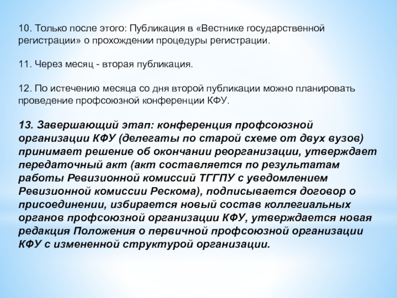 13. Завершающий этап: конференция профсоюзной организации КФУ (делегаты по старой схеме от двух вузов) принимает решение об окончании реорганизации, утверждает передаточный акт (акт составляется по результатам работы Ревизионной комиссий ТГГПУ с уведомлением Ревизионной комиссии Рескома), подписывается договор о присоединении, избирается новый состав коллегиальных органов профсоюзной организации КФУ, утверждается новая редакция Положения о первичной профсоюзной организации КФУ с измененной структурой организации.