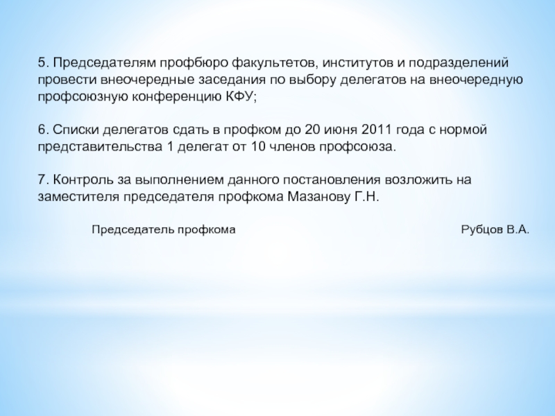 7. Контроль за выполнением данного постановления возложить на заместителя председателя профкома Мазанову Г.Н.