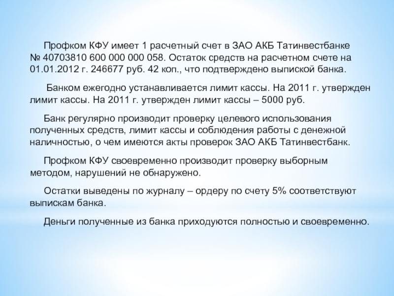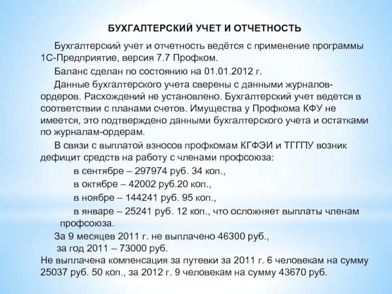 Данные бухгалтерского учета сверены с данными журналов-ордеров. Расхождений не установлено. Бухгалтерский учет ведется в соответствии с планами счетов. Имущества у Профкома КФУ не имеется, это подтверждено данными бухгалтерского учета и остатками по журналам-ордерам.