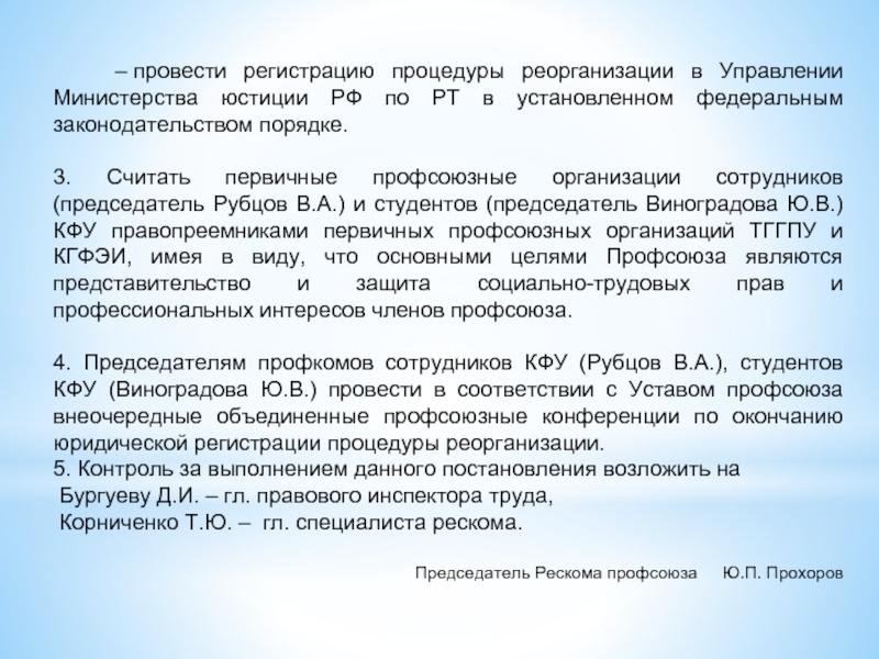 4. Председателям профкомов сотрудников КФУ (Рубцов В.А.), студентов КФУ (Виноградова Ю.В.) провести в соответствии с Уставом профсоюза внеочередные объединенные профсоюзные конференции по окончанию юридической регистрации процедуры реорганизации.