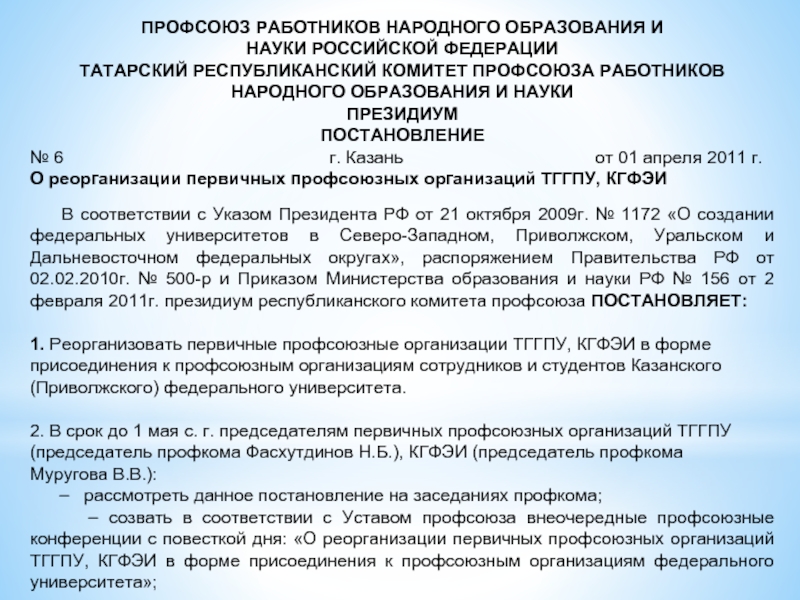 1. Реорганизовать первичные профсоюзные организации ТГГПУ, КГФЭИ в форме присоединения к профсоюзным организациям сотрудников и студентов Казанского (Приволжского) федерального университета.